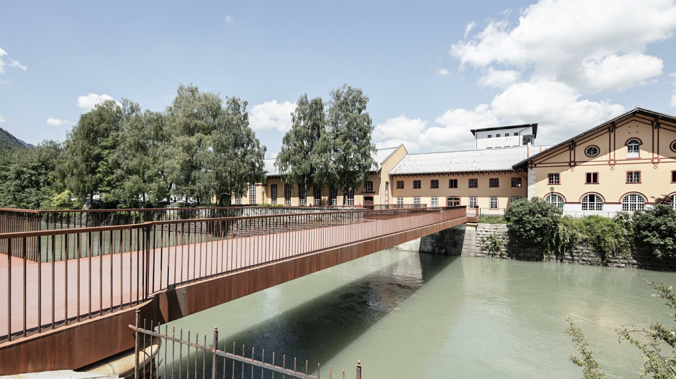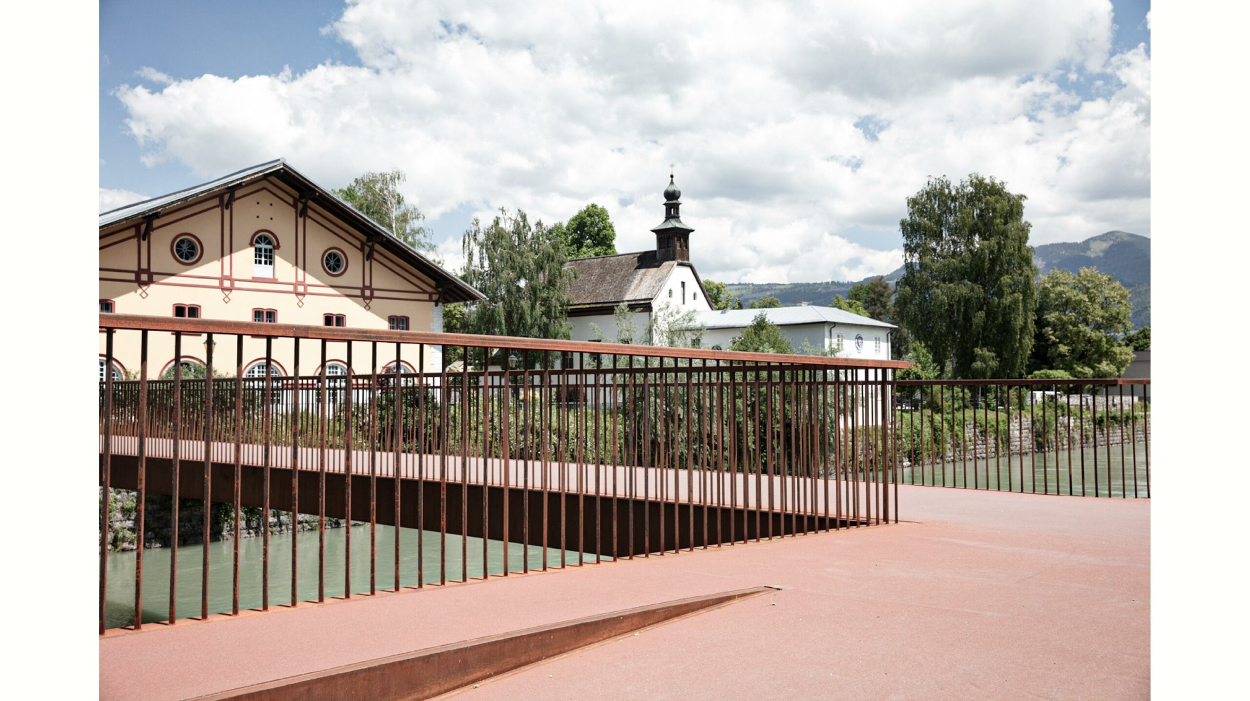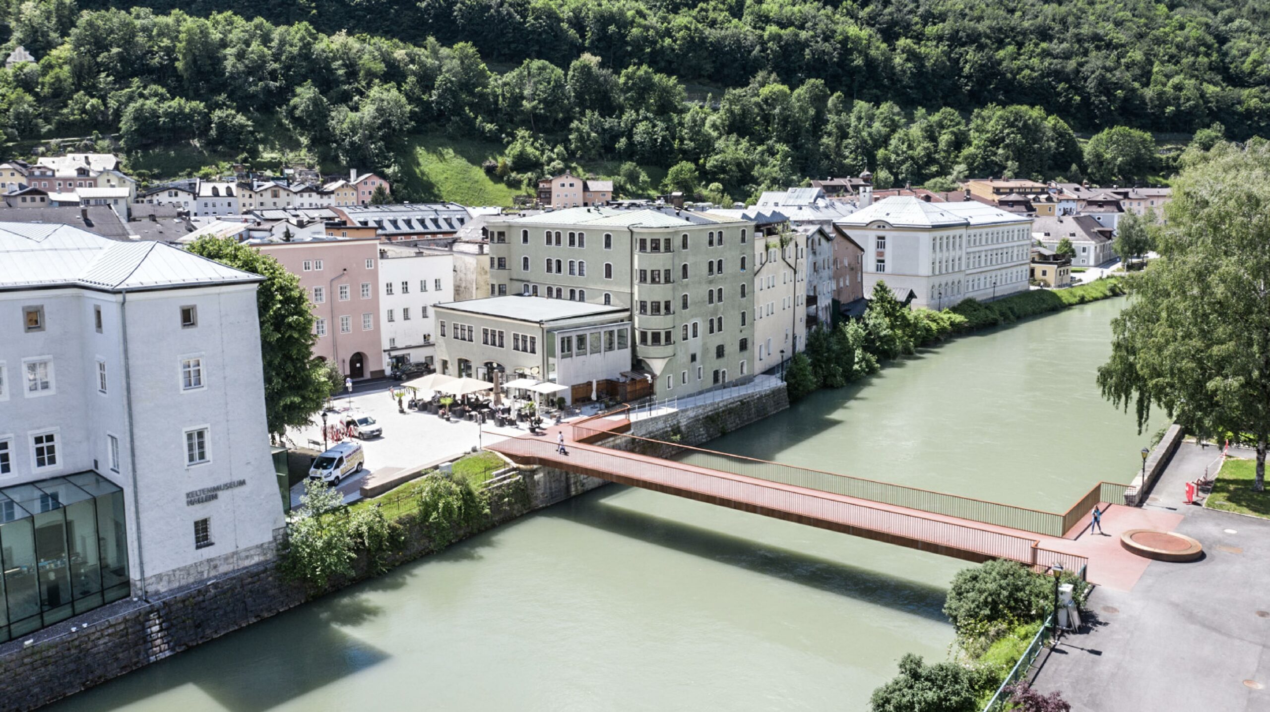Verbunden werden die beiden ausgeprägten Brückenköpfe durch ein filigranes Tragwerk. Dieses verbindet die Altstadt von Hallein und die Pernerinsel mit schlichter Eleganz.