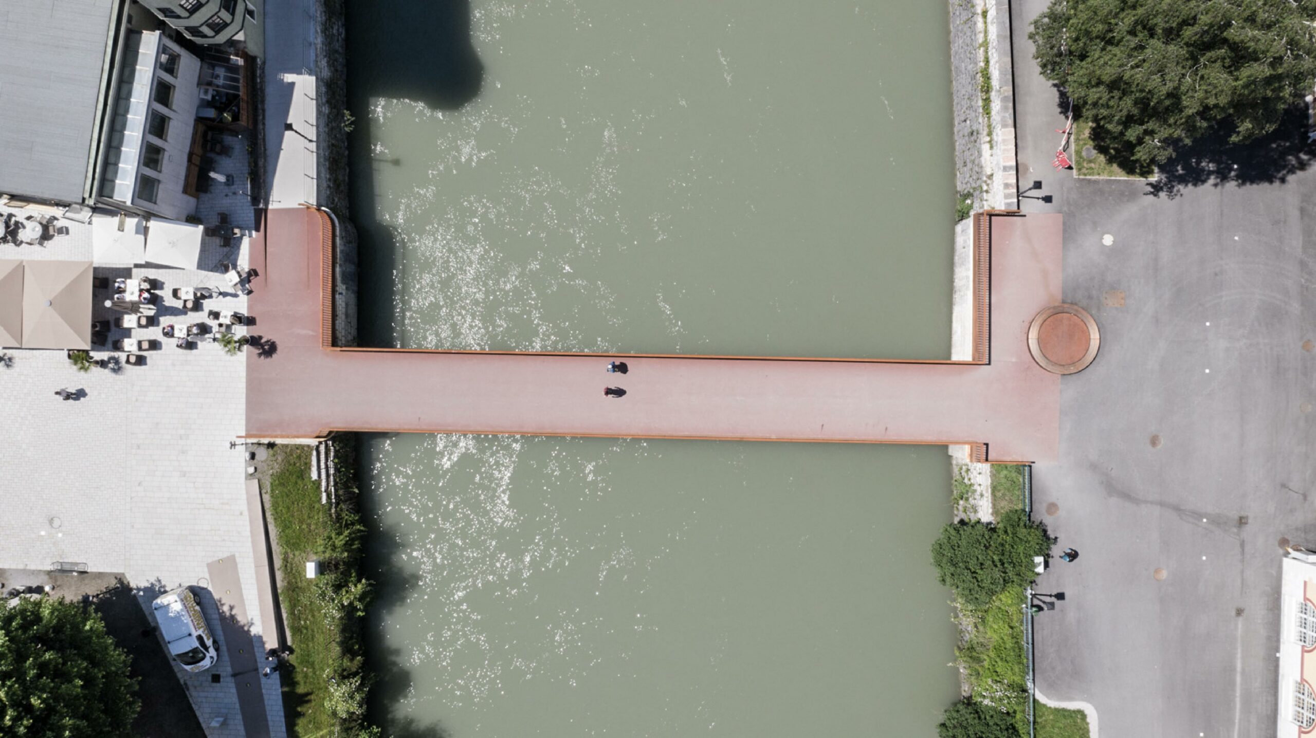 Der Pfannhausersteg über die Salzach in Hallein nimmt den Fußabdruck der alten Brücke auf und formuliert die neuen Auflagerbereiche in Form und Lage der historischen Widerlager und Ufermauern. Die dadurch entstehenden Aufweitungen in den Auflagerbereichen schaffen eine starke, emotionale Bindung zwischen dem Vorplatz, der alten Saline und dem Pfannhauserplatz auf der Altstadtseite.